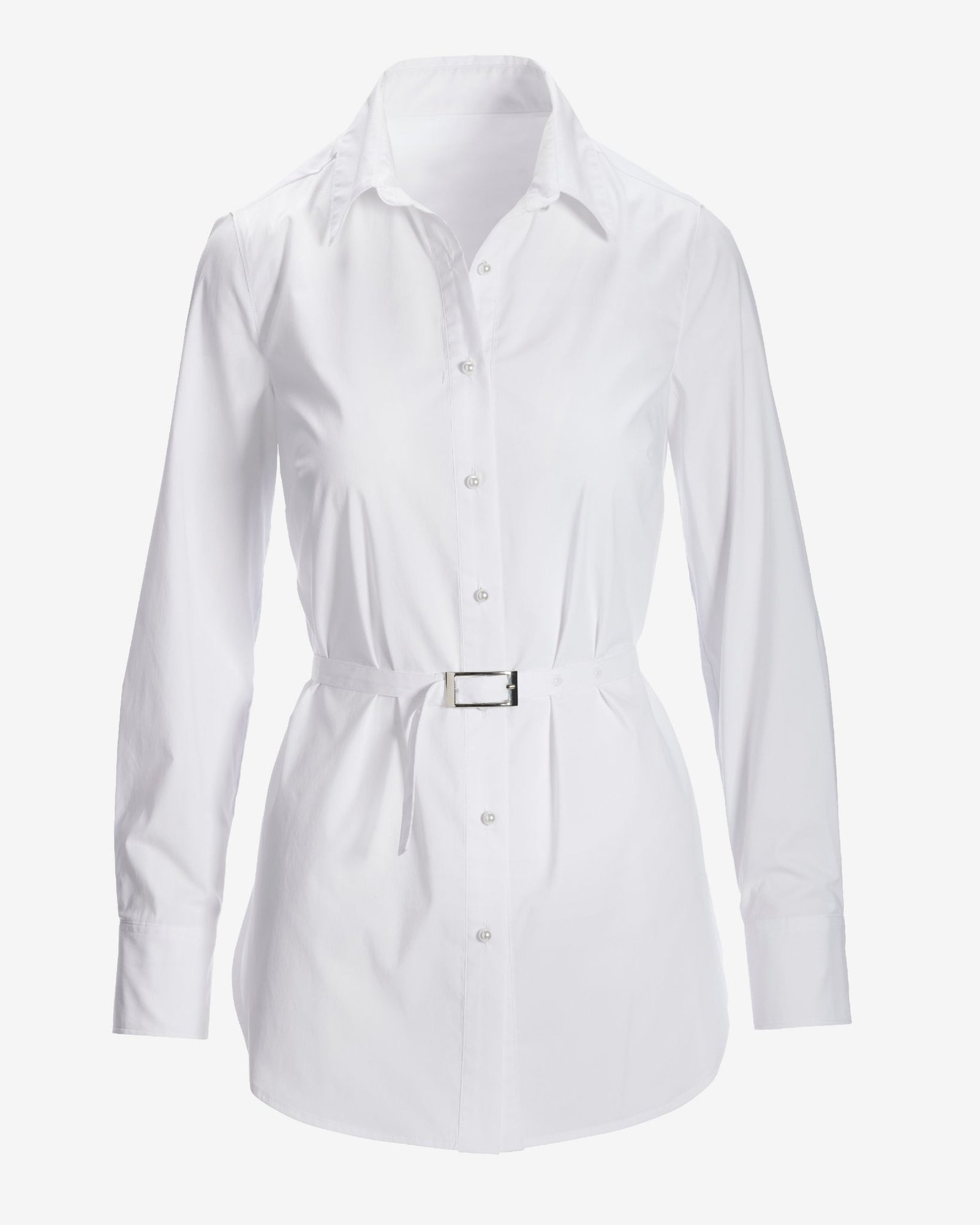 Our Belted Poplin Shirt breathes new life into your daytime looks with its sleek longer-length silhouette and waist-defining belt. This tailored design is made entirely unique by faux-pearl button accents and a shirttail hem with stylish side slits.